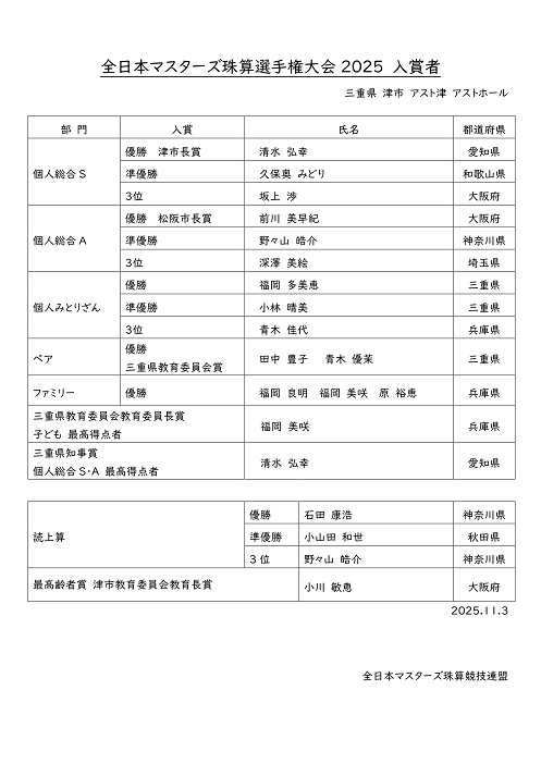 2026年大会は、 2026年11月21日土曜日 開催全日本マスターズ珠算選手権大会2025